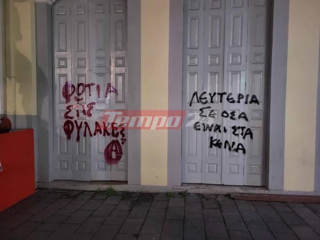 Άτομα που συμμετείχαν στην πορεία έγραψαν συνθήματα στο δημαρχείο της Πάτρας