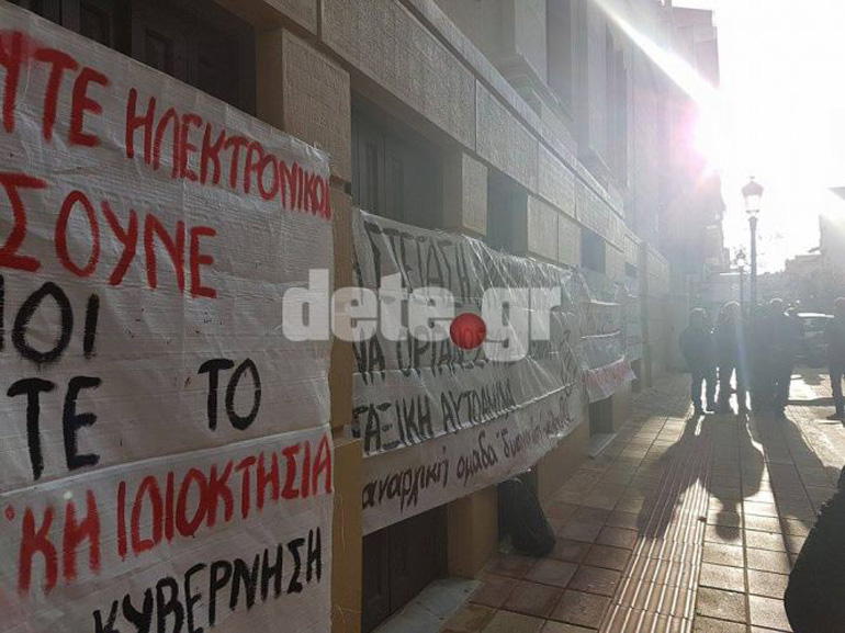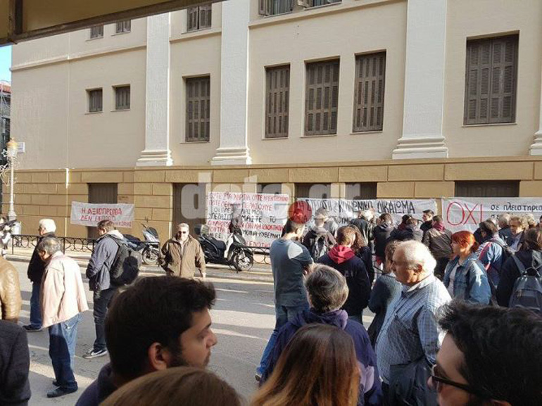 Μεγάλη συγκέντρωση πραγματοποιήθηκε την Τετάρτη το μεσημέρι έξω από το Ειρηνοδικείο Πατρών από φοιτητές, μέλη κινημάτων πολιτών, μέλη του ΠΑΜΕ, της ΛΑΕ και του ΕΠΑΜ, που βρέθηκαν έξω από το δικαστικό μέγαρο, με σκοπό να διαμαρτυρηθούν κατά των ηλεκτρονικών πλειστηριασμών, που ξεκίνησαν σήμερα μετά την αναστολή της αποχής των συμβολαιογράφων.