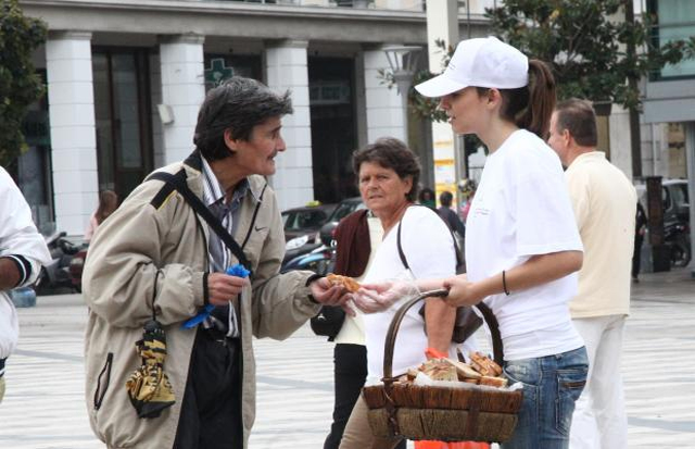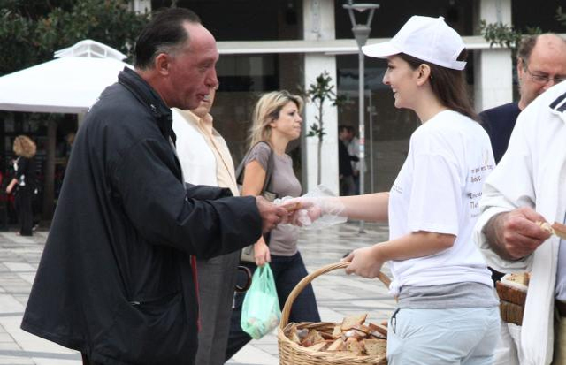 Με αφορμή τη σημερινή Παγκόσμια Ημέρα Ψωμιού, άρχισε, λίγο μετά τις 12.30 το μεσημέρι, στο κέντρο της Πάτρας, η διανομή αρτοσκευασμάτων, από την Συντεχνία Αρτοποιών της πόλης.