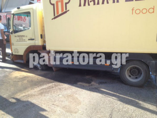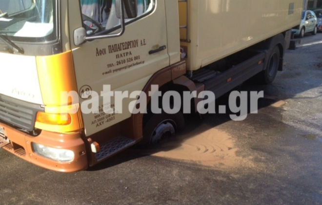 Άνοιξε η γη και το κατάπιε! Ο λόγος για ένα φορτηγό το οποίο έκανε το… λάθος να περάσει από την οδό Πέντε Πηγαδιών της Πάτρας, στην περιοχή της Αγίας Σοφίας, λίγες ημέρες αφότου στο σημείο είχε εκτελέσει εργασίες η τοπική εταιρεία Ύδρευσης.