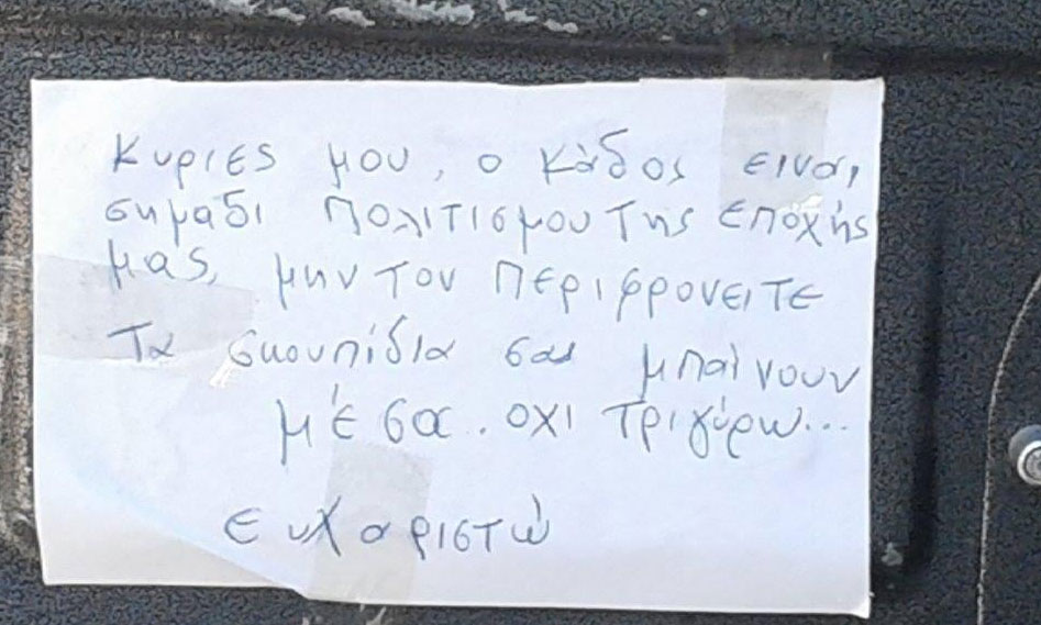 Πήρε ένα χαρτί, έγραψε εξοργισμένος την συμβουλή του και το κόλλησε πάνω σ’ ένα κάδο απορριμμάτων στην οδό Φιλοποίμενος.