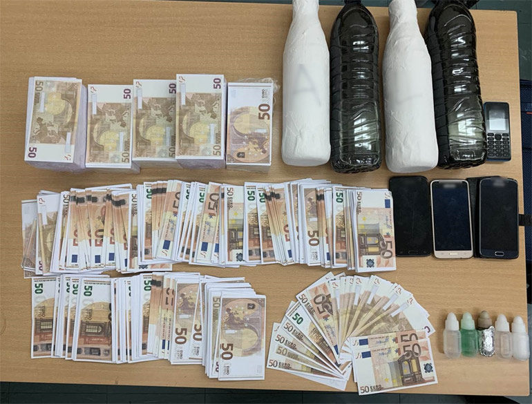 Επιπλέον, οι αστυνομικοί βρήκαν στο δωμάτιο των δύο συλληφθέντων, σε ξενοδοχείο της Πάτρας, 70.000 ευρώ, σε 1.400 πλαστά χαρτονομίσματα των 50 ευρώ, πέντε δεσμίδες λευκού χαρτιού στο μέγεθος του χαρτονομίσματος των 50 ευρώ, 11 πλαστικές φιάλες, που περιείχαν άγνωστη χημική ουσία και τέσσερα κινητά τηλέφωνα.