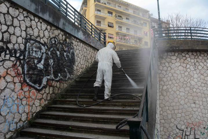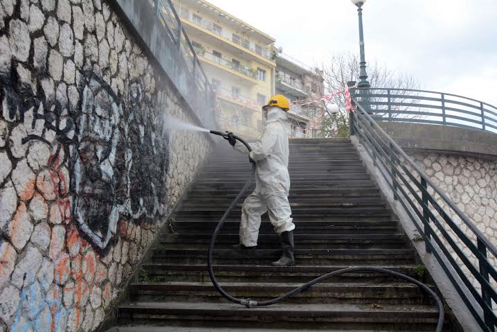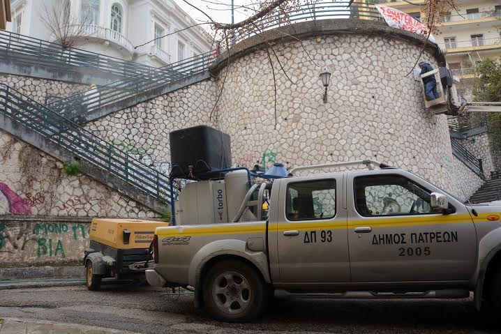 Συνεργεία του Δήμου Πατρέων καθάρισαν από γκράφιτι τον τοίχο και τις σκάλες στην Τριών Ναυάρχων με ειδικό μηχάνημα αμμοβολής.