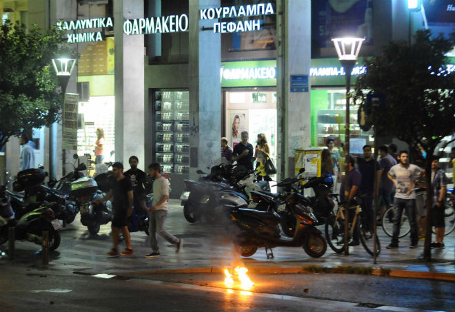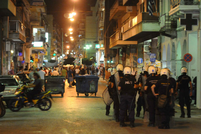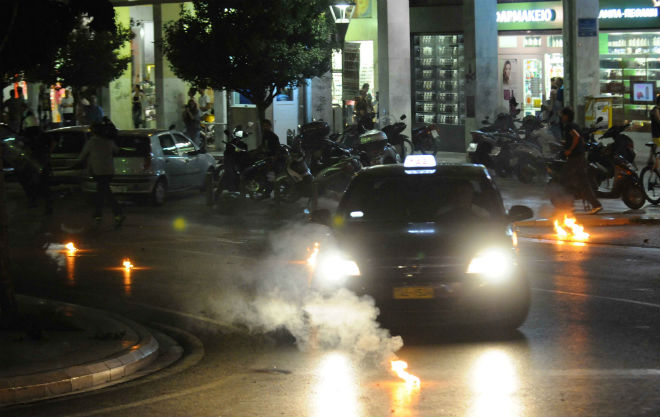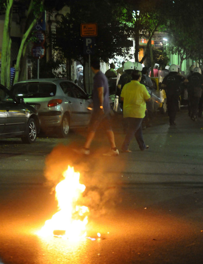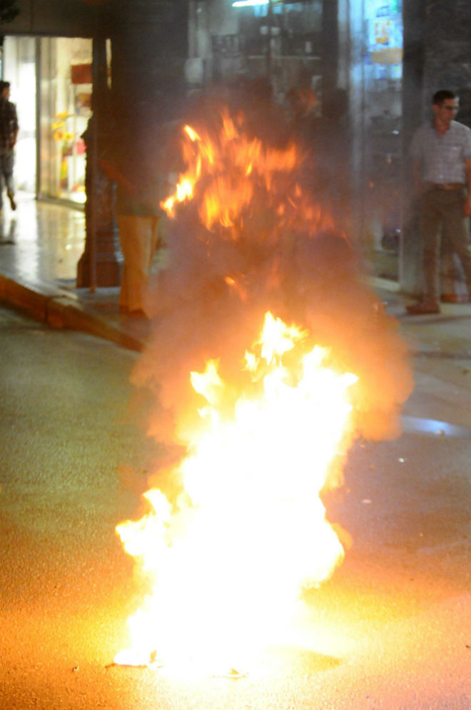 Λίγο μετά τις 20:30 το απόγευμα, ομάδα κρανοφόρων έριξε μολότοφ και κροτίδες, τόσο στην πλατεία Γεωργίου, όσο και στη συμβολή των οδών Κορίνθου και Φιλοποίμενος.