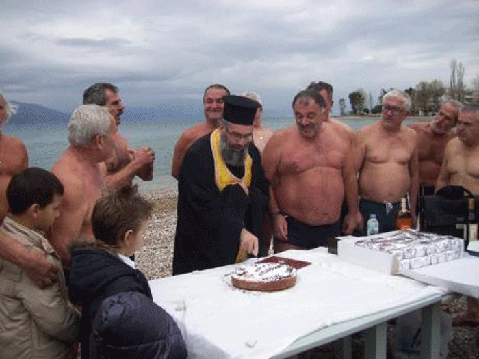 Ο Σύλλογος χειμερινών κολυμβητών Ρίου έκοψε την καθιερωμένη πρωτοχρονιάτικη πίτα του, στην παραλία Δημορηγόπουλου στο Ρίο.