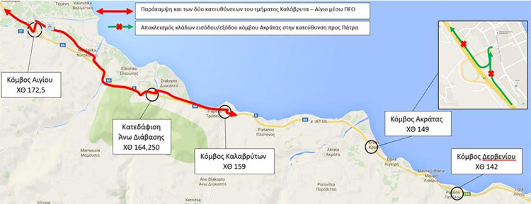 • Στην κατεύθυνση κυκλοφορίας προς Πάτρα, θα πραγματοποιείται εκτροπή της κυκλοφορίας από τον ανισόπεδο κόμβο Καλαβρύτων (Χ.Θ. 159,000) προς την Παλαιά Εθνική Οδό μέχρι τον ανισόπεδο κόμβο Ανατολικού Αιγίου (ΧΘ. 172,500) όπου η κυκλοφορία θα επανέρχεται εκ νέου στη Νέα Εθνική Οδό.