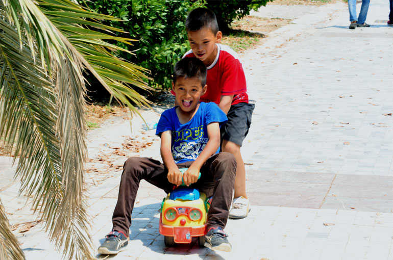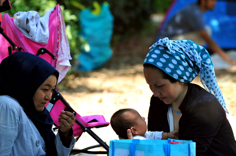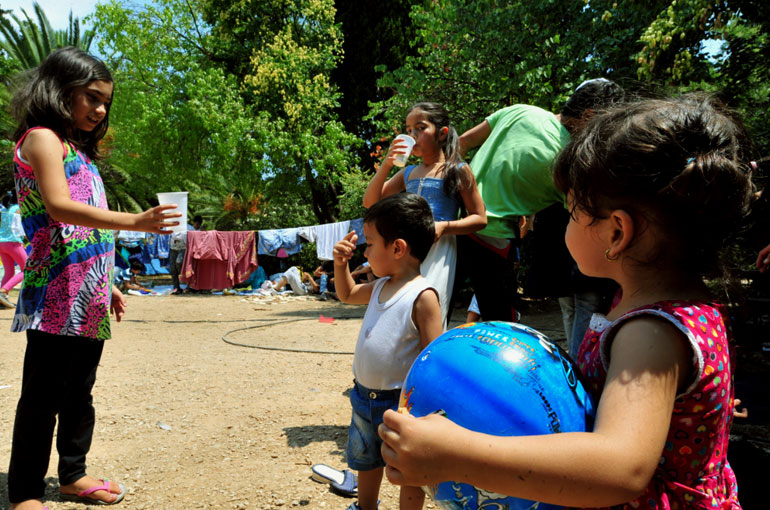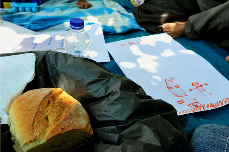 Προχωρώντας λίγα μέτρα πιο μακριά, βρίσκονται οι πρώτες σκηνές. Εντός τους βρίσκονται γυναίκες που κοιμίζουν τα παιδιά τους, ενώ άλλα παίζουν με παιχνίδια που τους έχουν προσφέρει εθελοντές.