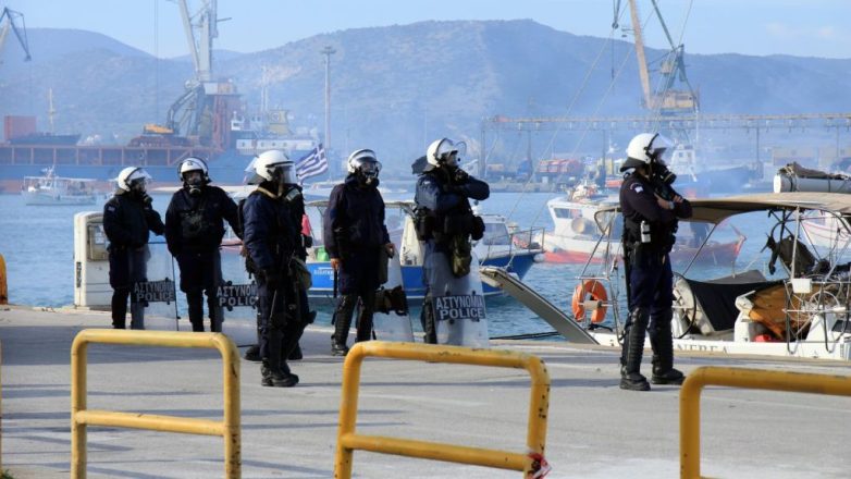 Οι δυνάμεις των ΜΑΤ βρίσκονται μέσα από τις πύλες του λιμανιού στο Βόλο