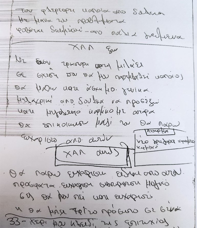 Ακόμα ένα από τα σημαντικά ευρήματα που κατάσχεσε η αστυνομία από το σπίτι της στην περιοχή του Ζωγράφου είναι τα ιδιόχειρα σημειώματα, τα οποία περιλαμβάνονται στη δικογραφία. Η ίδια γράφει μεταξύ άλλων στο σημείωμα: «Τον φλερτάρει κάποια από τη δουλειά…», ενώ σε άλλο σημείο αναφέρει: «Θα μάθω κάτι άσχημο…».
