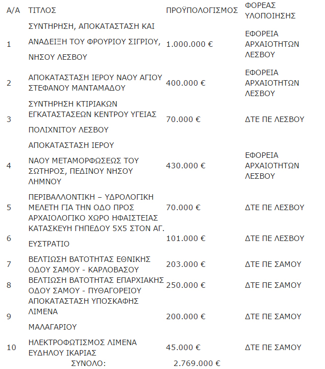 Όσον αφορά στην κατανομή των επιπλέον πιστώσεων σε έργα στις ΠΕ Χίου και Λέσβου, ισχύουν τα ακόλουθα: