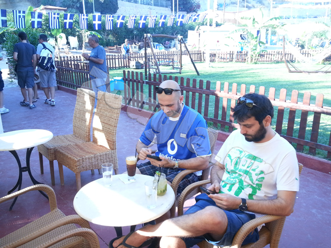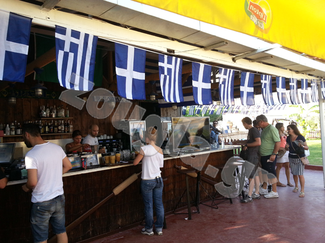 Η ατμόσφαιρα στους χώρους του beach bar «Βοτσαλάκια» στη Φρεατίδα είναι γιορτινή. Άνδρες, γυναίκες και μικρά παιδιά με τα χρώματα της γαλανόλευκης έχουν γίνει «ένα», περιμένοντας από την Εθνική να μπει με το «δεξί» στη διοργάνωση, μέσα σ’ ένα ωραίο περιβάλλον, όπου το μπλε και το λευκό χρώμα κυριαρχούν λόγω της περίστασης.
