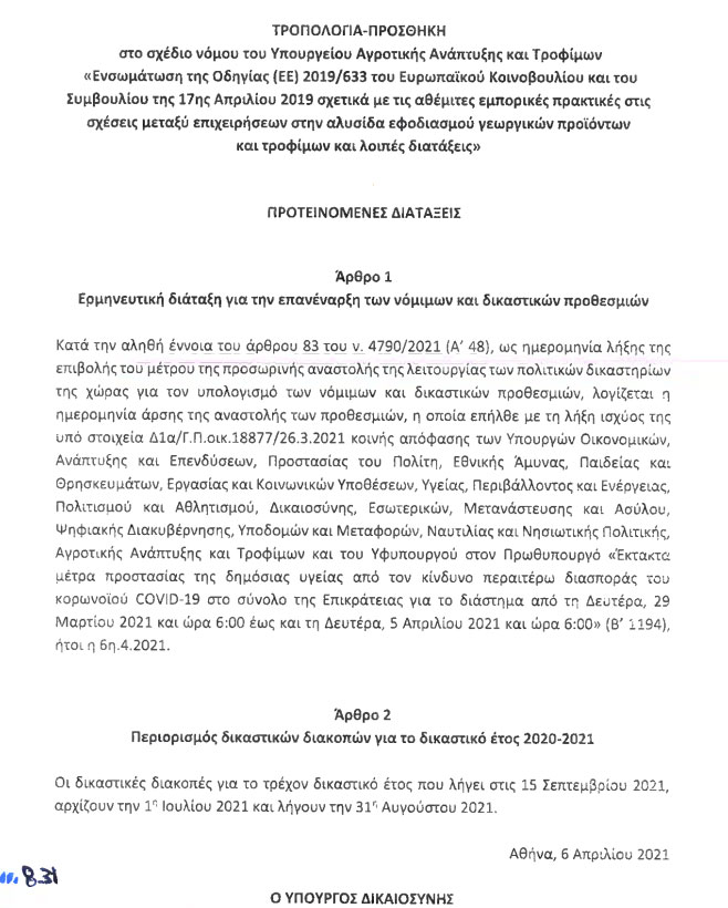 Περιορίζονται οι δικαστικές διακοπές κατά 15 ημέρες, με τροπολογία που κατέθεσε ο Υπουργός Δικαιοσύνης Κώστας Τσιάρας στο σχέδιο νόμου του Υπουργείου Αγροτικής Ανάπτυξης & Τροφίμων «Ενσωμάτωση της Οδηγίας (ΕΕ) 2019/633 του Ευρωπαϊκού Κοινοβουλίου και του Συμβουλίου της 17ης Απριλίου 2019 σχετικά με τις αθέμιτες εμπορικές πρακτικές στις σχέσεις μεταξύ επιχειρήσεων στην αλυσίδα εφοδιασμού γεωργικών προϊόντων και τροφίμων και λοιπές διατάξεις.»