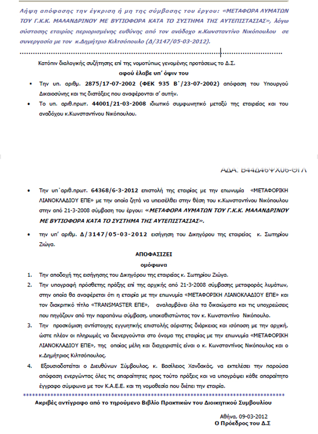 Η εν λόγω εταιρεία με την υπ. αριθμ. 368/07-03-2012 απόφασή της συνάπτει πρόσθετη πράξη επί της αρχικής από 21-3-2008 σύμβασή της για τη «ΜΕΤΑΦΟΡΑ ΛΥΜΑΤΩΝ ΤΟΥ Γ.Κ.Κ. ΜΑΛΑΝΔΡΙΝΟΥ ΜΕ ΒΥΤΙΟΦΟΡΑ ΚΑΤΑ ΤΟ ΣΥΣΤΗΜΑ ΤΗΣ ΑΥΤΕΠΙΣΤΑΣΙΑΣ» με την εταιρεία «ΜΕΤΑΦΟΡΙΚΗ ΛΙΑΝΟΚΛΑΔΙΟΥ ΕΠΕ». Δηλαδή το Ελληνικό Δημόσιο επί χρόνια καταβάλλει χιλιάδες ευρώ σε εργολάβο για τη μεταφορά των λυμάτων, ενώ θα ήταν λιγότερο δαπανηρό να κατασκευαστεί ένας σύγχρονος Βιολογικός Καθαρισμός στις Φυλακές Μαλανδρίνου.