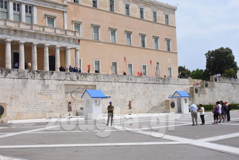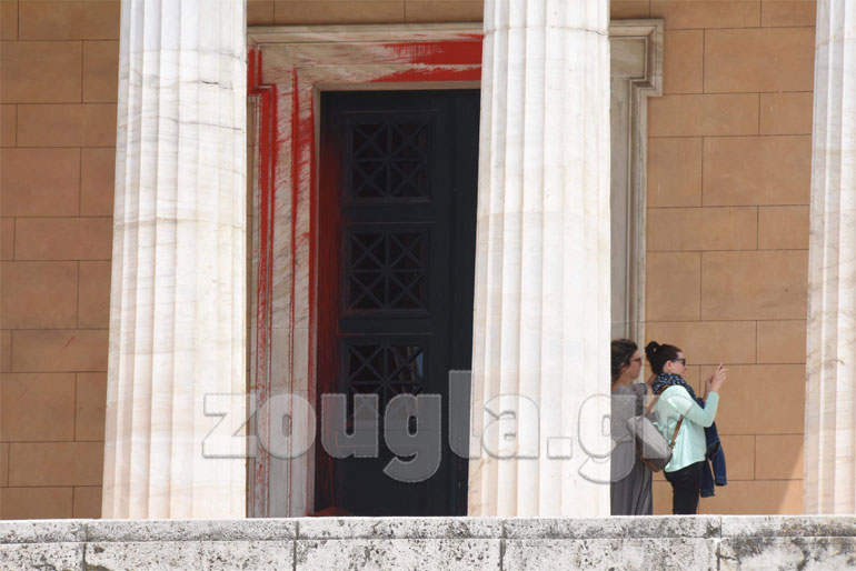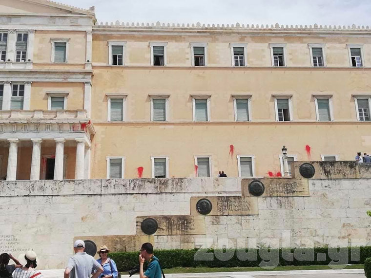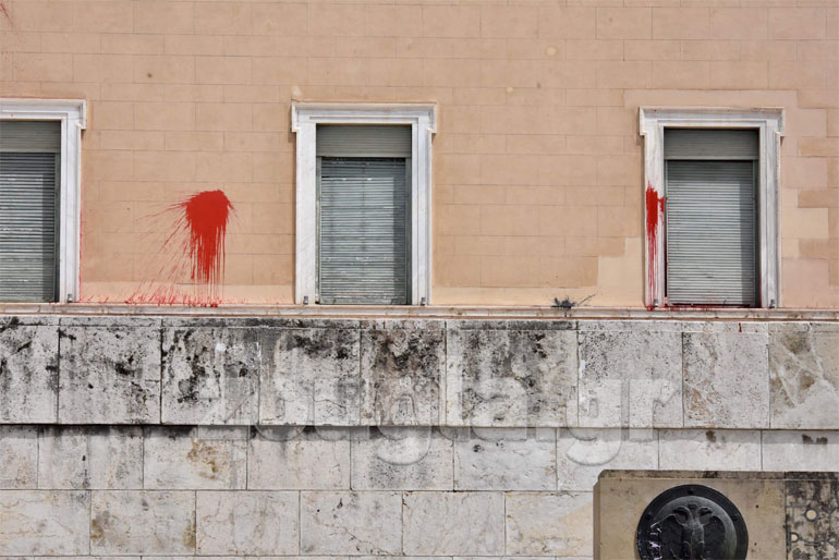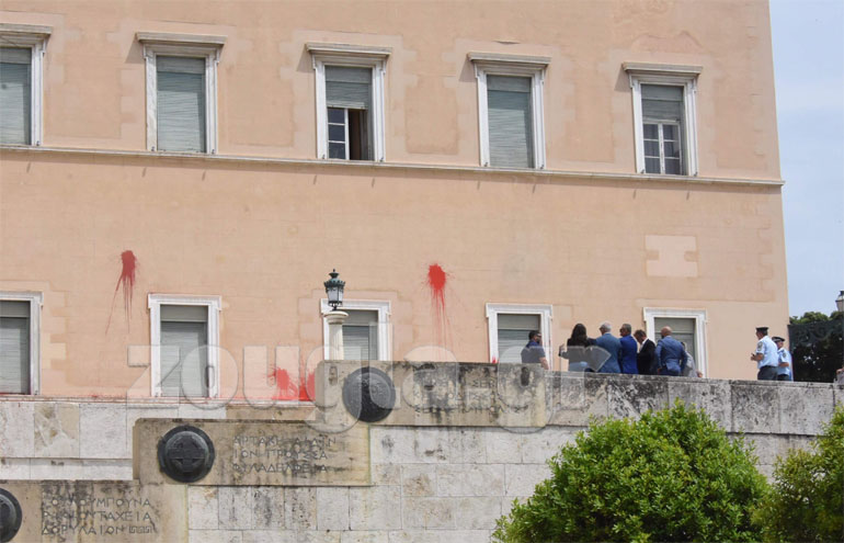 Ομάδα περίπου 15 μελών του «Ρουβίκωνα» πλησίασε στις 14.10 το Κοινοβούλιο από τα σκαλάκια επί της Όθωνος και πέταξε μπογιές κόκκινου και μαύρου χρώματος, τρικάκια προς το κτήριο της Βουλής, ενώ άναψε και δύο καπνογόνα.