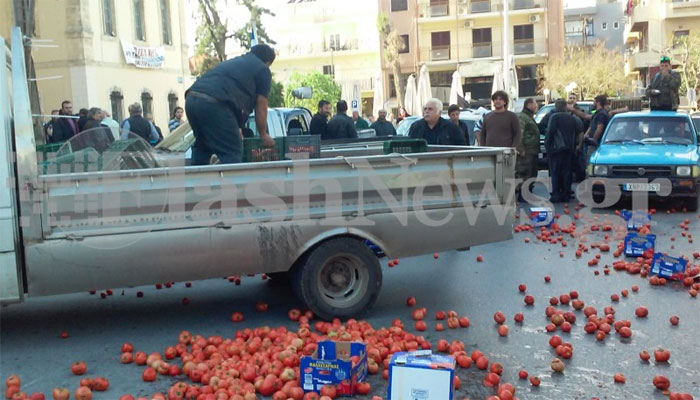 «Κόκκινος» ο δρόμος μπροστά από το κτίριο της περιφερειακής ενότητας Χανίων, καθώς το μεσημέρι, αγρότες πέταξαν ντομάτες, στο πλαίσιο των κινητοποιήσεών τους.