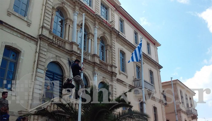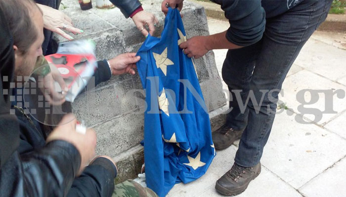 Στη συνέχεια οι αγρότες ανέβηκαν στην αντιπεριφέρεια κατέβασαν τη σημαία της Ε.Ε. και την έκαψαν.