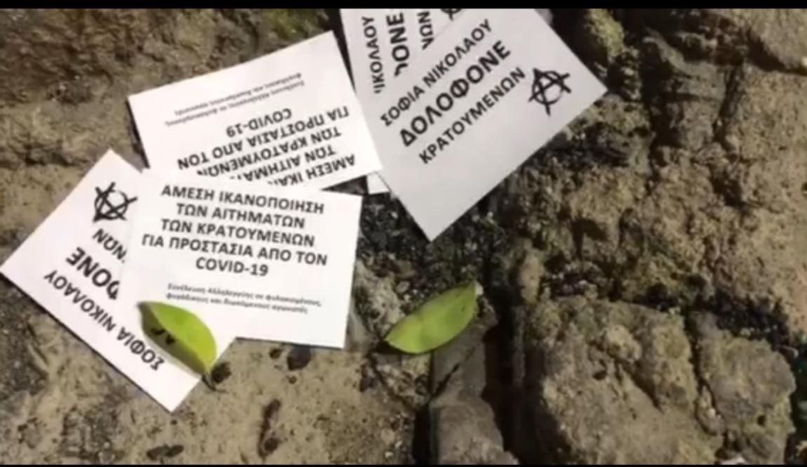 Σύμφωνα με πληροφορίες, τέσσερις άγνωστοι που επενέβαιναν σε δύο μοτοσικλέτες, πέταξαν έξω από το γραφείο της στην οδό Αμερικής, τρικάκια για τις συνθήκες κράτησης στις φυλακές και την προστασία των κρατουμένων από τον κορωνοϊό.