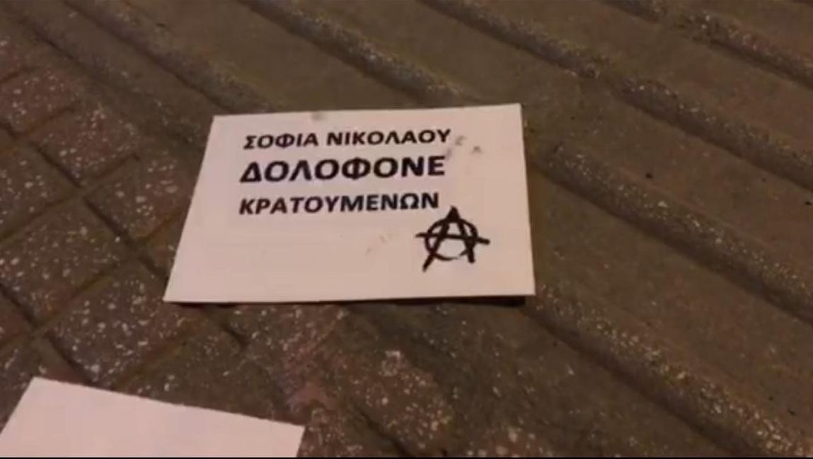 Άγνωστοι πέταξαν τρικάκια έξω από το γραφείο της Γενικής Γραμματέως Αντεγκληματικής Πολιτικής, Σοφίας Νικολάου στις 20:40 το βράδυ της Κυριακής.