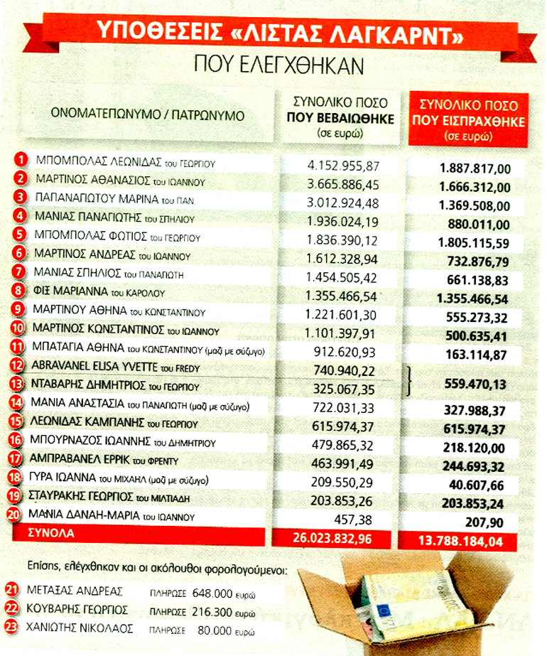 Συνολικά 23 φυσικά πρόσωπα της περίφημης λίστας Λαγκάρντ, που ελέγχθηκαν από τις φορολογικές Αρχές, καθώς εντοπίστηκαν σημαντικά εισοδήματά τους στο εξωτερικό, υποχρεώθηκαν να καταβάλουν πάνω από 14,7 εκατομμύρια ευρώ στο Δημόσιο.