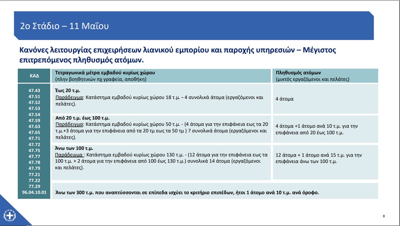 Για τις επιχειρήσεις Λιανικού εμπορίου ο μέγιστος επιτρεπόμενος αριθμός ατόμων (εργαζόμενοι και πελάτες ) εντός του κυρίως χώρου υπολογίζεται ως εξής: