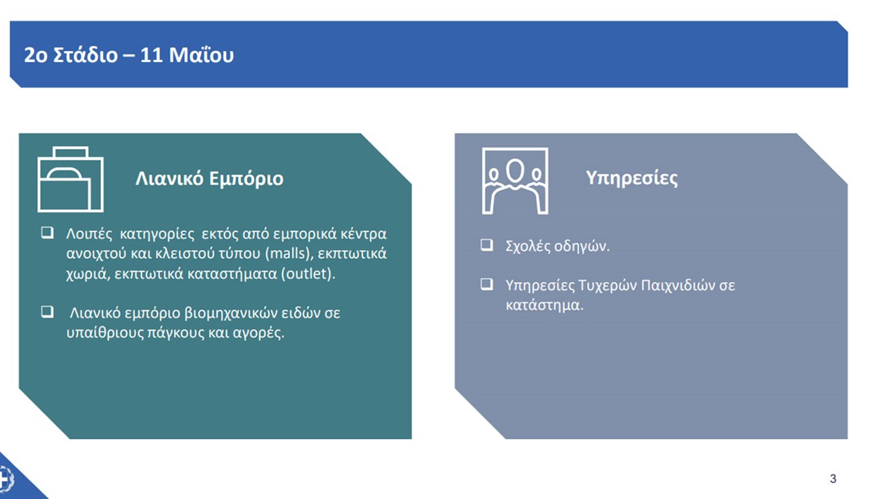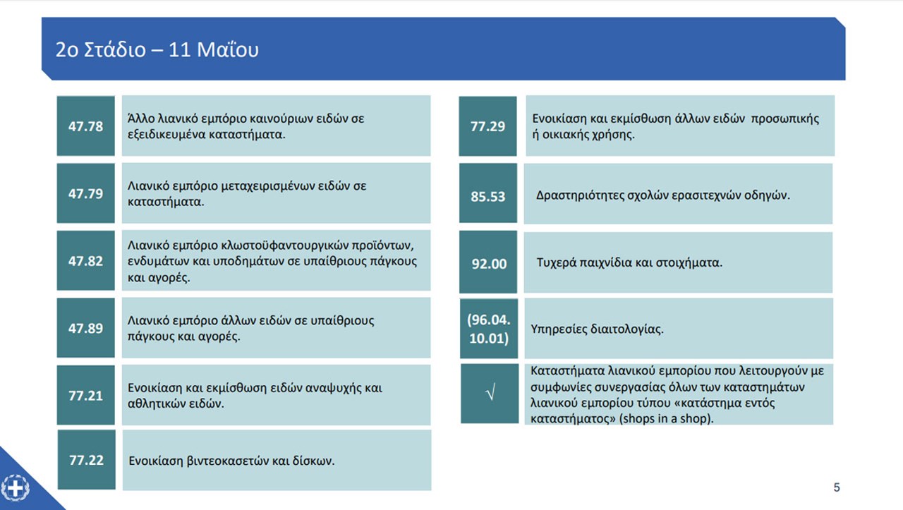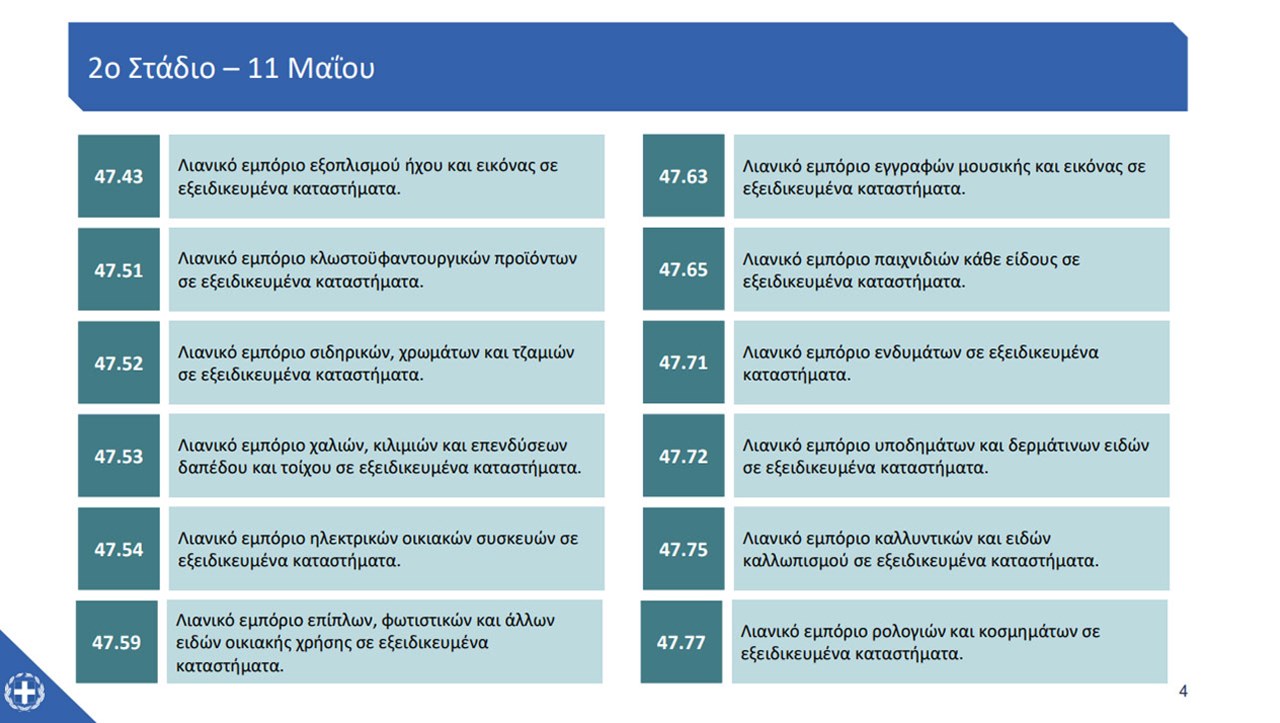 Την ίδια ημερομηνία επαναλειτουργούν οι επιχειρήσεις με αντικείμενο το λιανικό εμπόριο σε υπαίθριους πάγκους και αγορές κλωστοϋφαντουργικών προϊόντων, ενδυμάτων και υποδημάτων καθώς και άλλων ειδών.