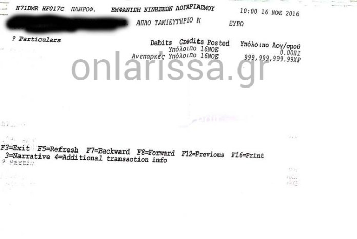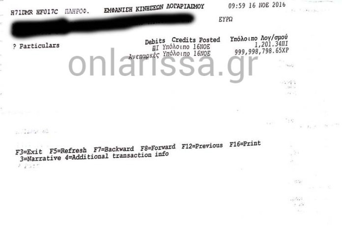 Το απίθανο περιστατικό συνέβη πριν από έναν περίπου μήνα, σε υποκατάστημα μεγάλης ελληνικής τράπεζας στη Λάρισα, εκεί όπου είχε μεταβεί ο επιχειρηματίας για να πραγματοποιήσει ενημέρωση σε συνολικά έξι εταιρικούς λογαριασμούς.