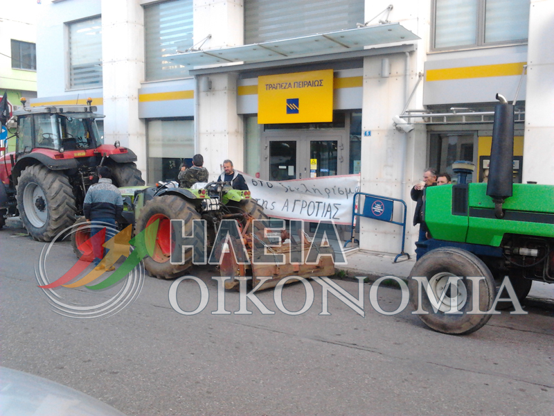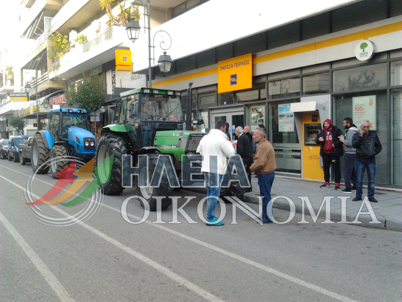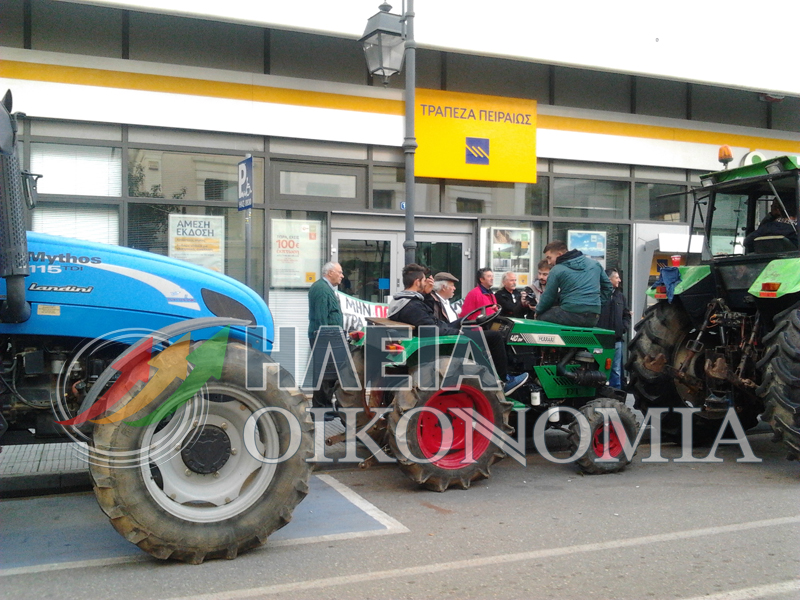 Αγρότες από το μπλόκο στον κόμβο του Αγίου Γεωργίου απέκλεισαν με τρακτέρ από νωρίς το πρωί της Παρασκευής δύο υποκαταστήματα της Τράπεζας Πειραιώς στον Πύργο.