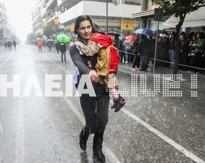 Την ώρα που μικροί και μεγάλοι προσπαθούσαν να προστατευτούν από τη βροχή και το χαλάζι, εκείνη σε πείσμα όλων όσων συμβαίνουν σε αυτήν τη χώρα και εξοργισμένη με την καθυστέρηση των επισήμων να παρευρεθούν στην εξέδρα τους (λόγω κακοκαιρίας), έκανε κάτι αυθόρμητο. Πήρε την τεσσεράμισι ετών κόρη της και μια ελληνική σημαία στα χέρια και ξεκίνησε να κάνει παρέλαση μέσα στην καταιγίδα.