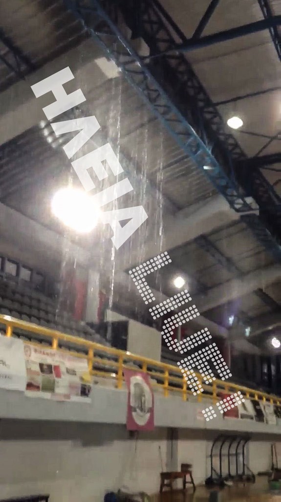 Πρωτοφανείς εικόνες καταγράφηκαν κατά τη διάρκεια αγώνα μπάσκετ στον Πύργο Ηλείας, καθώς από την οροφή του κλειστού γυμναστηρίου άρχισαν να τρέχουν «καταρράκτες» λόγω της έντονης βροχόπτωσης.