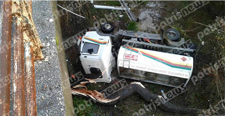 Ένα βυτιοφόρο όχημα, στο οποίο επέβαιναν δύο άτομα, έπεσε από τη γέφυρα του Αλφειού και κατέληξε στις όχθες του ποταμού, με αποτέλεσμα τον ελαφρύ τραυματισμό των επιβαινόντων.