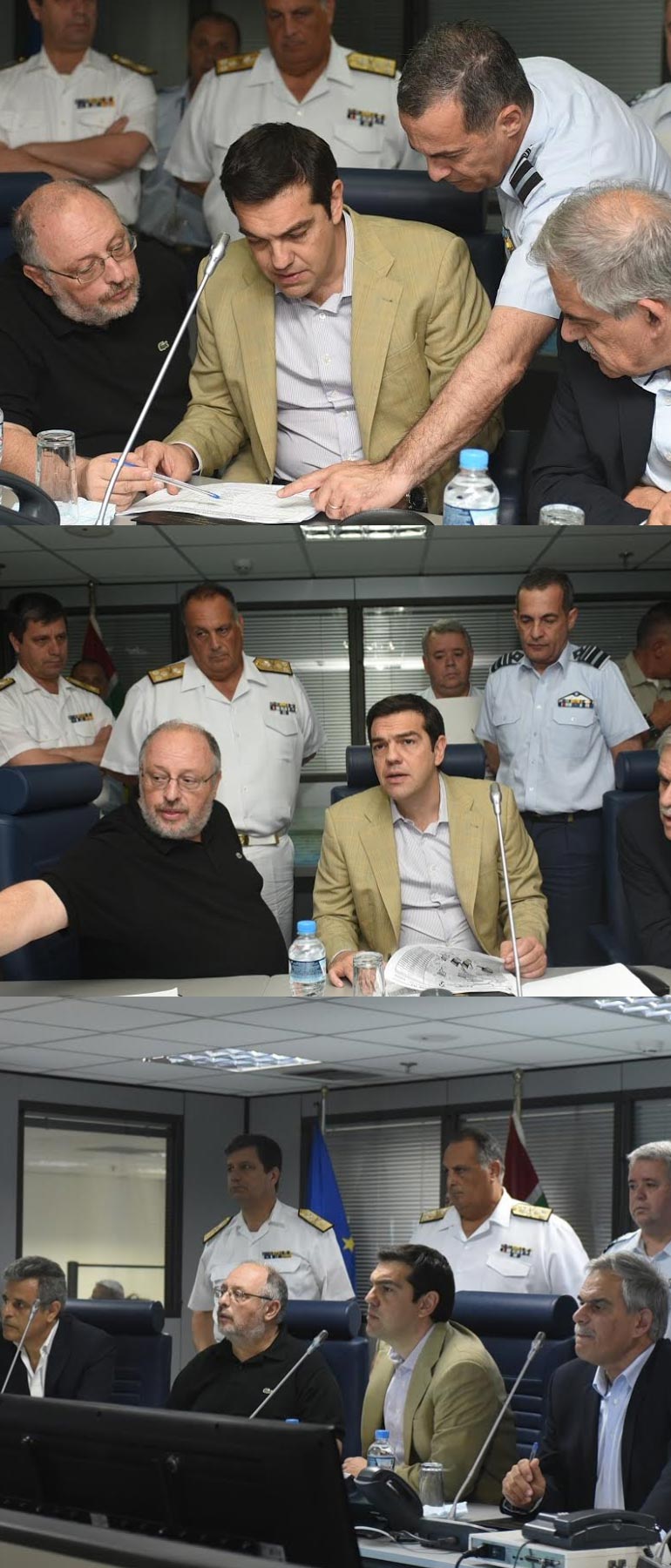 Ο πρωθυπουργός επισκέφθηκε το Υπουργείο Εθνικής Άμυνας όπου του έγινε ενημέρωση στο Εθνικό Κέντρο Επιχειρήσεων (ΕΘΚΕΠΙΧ) από τον -μέχρι πρότινος- Αναπληρωτή Υπουργό Εθνικής Άμυνας Κώστα Ήσυχο και τον Υφυπουργό Εθνικής Άμυνας Νίκο Τόσκα για την εξέλιξη των επιχειρήσεων κατάσβεσης στα μέτωπα των πυρκαγιών. Βρίσκονταν σε διαρκή επικοινωνία με τον Υπουργό Εθνικής Άμυνας Πάνο Καμμένο.
