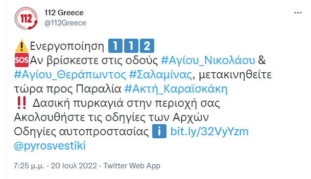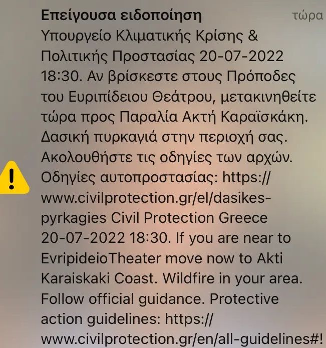 Στις 19:30 νέο μήνυμα από το 112 ζητά από τους πολίτες που βρίσκονται στις οδούς Αγίου Νικολάου και Αγίου Θεράπωντος να εκκενώσουν τα σπίτια τους και να μετακινηθούν επίσης προς την παραλία της Ακτής Καραϊσκάκη.