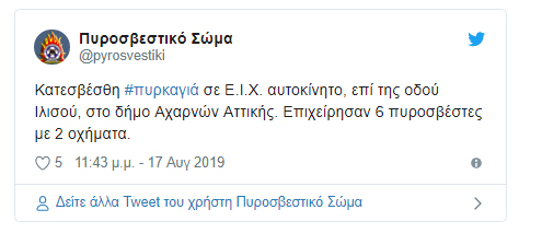 Kατεσβέσθη πυρκαγιά σε Ε.Ι.Χ. αυτοκίνητο, επί της οδού Ιλισού, στο δήμο Αχαρνών Αττικής. Στην επιχείρηση συμμετείχαν 6 πυροσβέστες με 2 οχήματα....