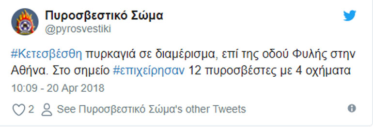 Σύμφωνα με την Πυροσβεστική, στο σημείο έσπευσαν 12 πυροσβέστες με 4 οχήματα, οι οποίοι έθεσαν υπό έλεγχο και στη συνέχεια έσβησαν έγκαιρα τη φωτιά, χωρίς να επεκταθεί σε παρακείμενες οικίες.