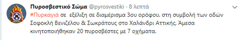 Σε εξέλιξη βρίσκεται πυρκαγιά που εκδηλώθηκε πριν από λίγη ώρα σε διαμέρισμα τρίτου ορόφου, στη συμβολή των οδών Σοφοκλή Βενιζέλου και Σωκράτους, στο Χαλάνδρι.