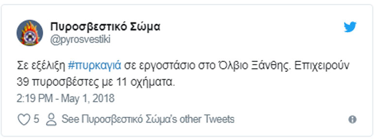 «Σήμερα, 1η Μαΐου, λίγο πριν τη 1.00 το μεσημέρι ξέσπασε φωτιά από άγνωστη μέχρι στιγμής αιτία στο εργοστάσιο μπαταριών της ΣΥΣΤΗΜΑΤΑ SUNLIGHT στο Όλβιο Ξάνθης. Εφαρμόζοντας απόλυτα το σύστημα εκτάκτων αναγκών και τηρώντας τις διαδικασίες ασφαλείας, ενημερώθηκαν οι αρμόδιες αρχές, και όλοι οι εργαζόμενοι είναι απόλυτα ασφαλείς και καλά στην υγεία τους.