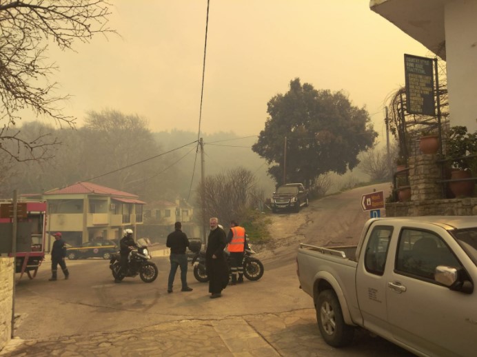 Η φωτιά ξέσπασε κοντά στη Μονή Βροντά και σύμφωνα με την Πυροσβεστική πήρε γρήγορα διαστάσεις, καίγοντας δασική έκταση.
