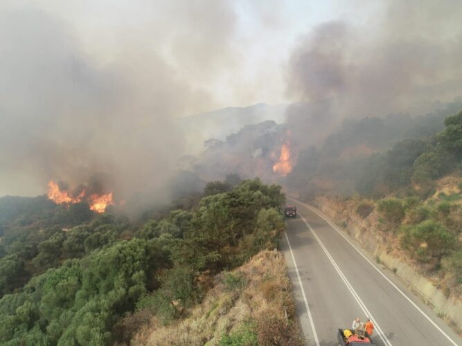 Η φωτιά προκλήθηκε από άγνωστη μέχρι στιγμής αιτία στις 07:00 το πρωί της Πέμπτης. Το έργο των πυροσβεστών δυσχεραίνουν οι άνεμοι, η ένταση των οποίων φτάνει τα επτά μποφόρ.