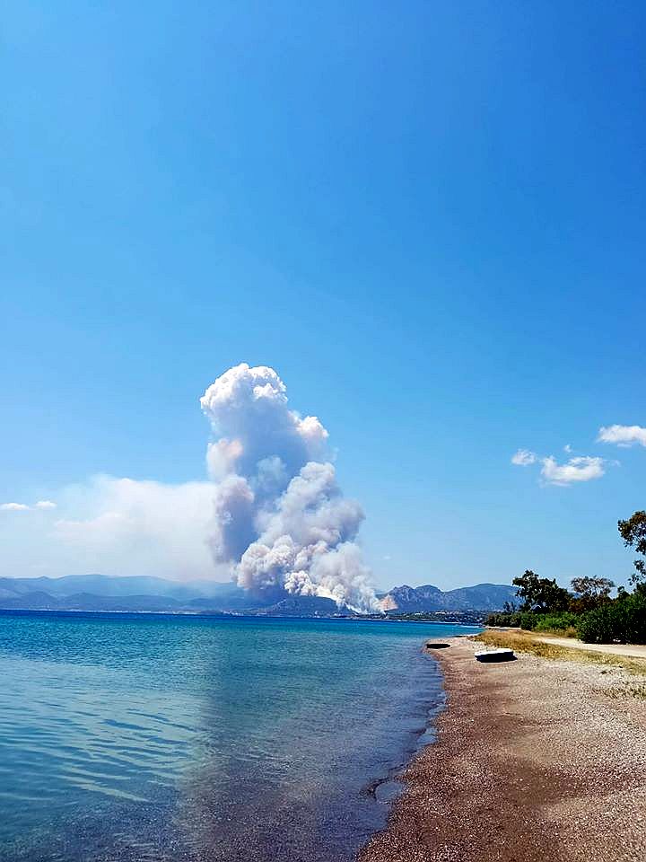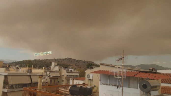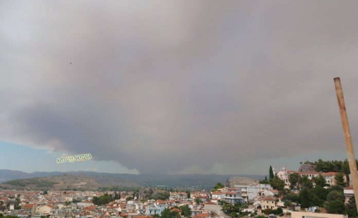 Ιδιαίτερα στις 17:00 με τον άνεμο να φυσά μανιωδώς, ο καπνός από τη μεγάλη φωτιά στην Κορινθία έφτασε πάνω από τον ουρανό του Ναυπλίου, όπως φαίνεται στις παρακάτω φωτογραφίες του argponafplia.gr.