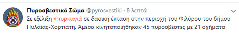 Πυρκαγιά ξέσπασε τα ξημερώματα της Πέμπτης στο Φίλυρο Θεσσαλονίκης. Στο σημείο έχουν σπεύσει και επιχειρούν 21 οχήματα της Πυροσβεστικής και 45 πυροσβέστες.