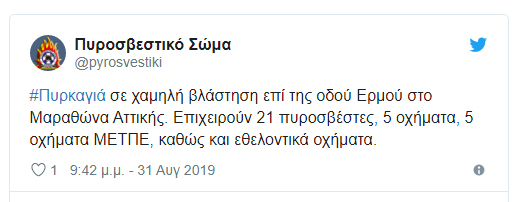 Πυρκαγιά ξέσπασε σε χαμηλή βλάστηση επί της οδού Ερμού στο Μαραθώνα Αττικής. Επιχειρούν 21 πυροσβέστες, 5 οχήματα, 5 οχήματα...