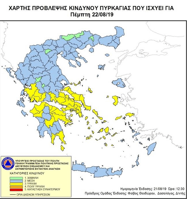 Σύμφωνα με τη Γενική Γραμματεία Πολιτικής Προστασίας για την Πέμπτη 22 Αυγούστου προβλέπεται υψηλός κίνδυνος εκδήλωσης πυρκαγιάς σε Αττική, Αν. Στερεά, Χίο, Σάμο, Ικαρία, Κυκλάδες, Κύθηρα, Λακωνία, Αρκαδία, Αργολίδα, Κορινθία, Αχαΐα, Ηλεία & Αιτωλοακαρνανία.
