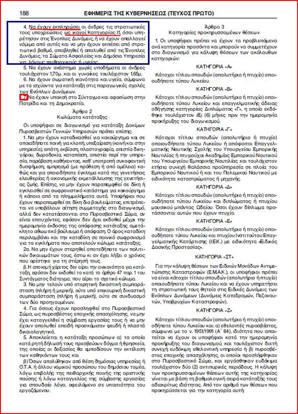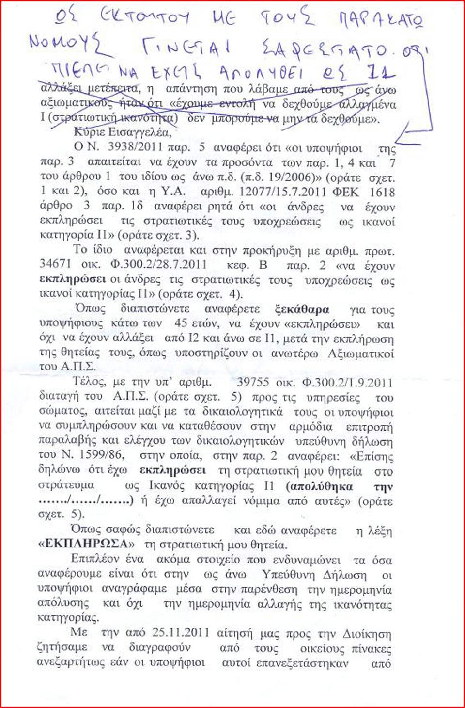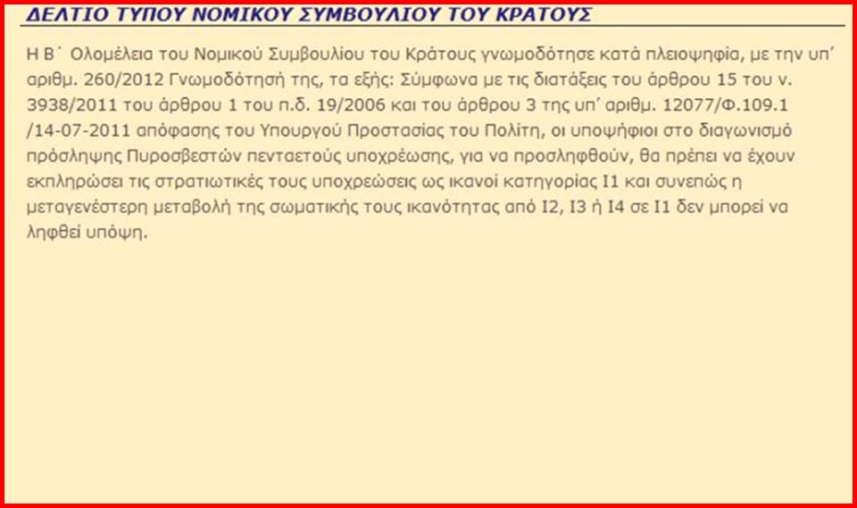 Το Νομικό Συμβούλιο, αφού μελέτησε το θέμα, κατέληξε στο συμπέρασμα ότι, όταν κάποιος πολίτης δεν έχει «απολυθεί» από τον στρατό ως «Ι1 ικανός», δεν έχει δικαίωμα να συμμετάσχει στην προκήρυξη, πόσο δε μάλλον να καταταγεί στο Σώμα.