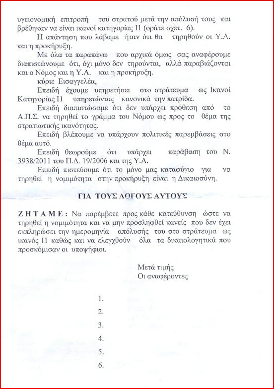 «Το συμβούλιο ήταν με το μέρος μας. Αφού και η υπεύθυνη δήλωση που υπογράψαμε αναφέρει ότι “έχω ολοκληρώσει τη στρατιωτική μου θητεία στο στράτευμα ως ικανός Ι1 και απολύθηκα την τάδε ημερομηνία. Αφού αναφέρει και την ημερομηνία απόλυσης, σημαίνει ότι μετράει ο βαθμός του Ι που απολύθηκα και όχι αυτός που διαμορφώθηκε μετά την απόλυσή μου» περιγράφει στη zougla.gr ένας εκ των επιλαχόντων.