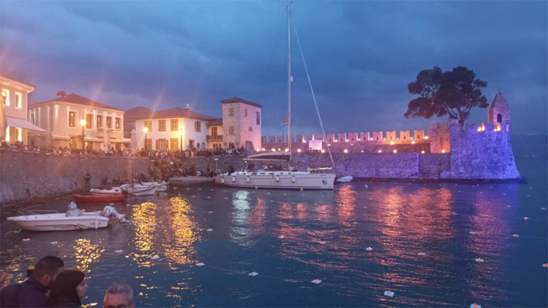 Γέμισε από χιλιάδες κόσμου το βράδυ της Μεγάλης Παρασκευής το ενετικό λιμάνι της Ναυπάκτου για τη συνάντηση των δύο Επιταφίων της πόλης, του Αγίου Δημητρίου και της Αγίας Παρασκευής.