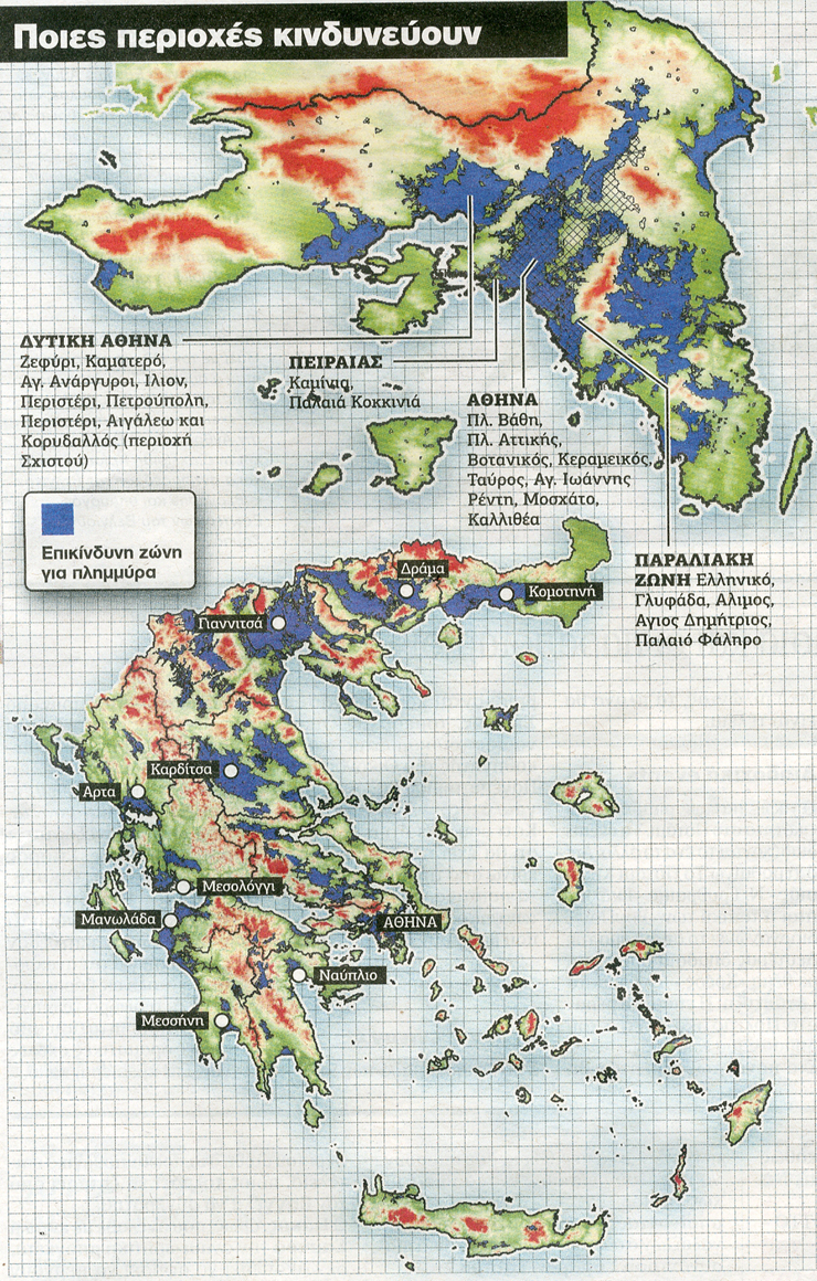 Σημειώνεται ότι ο χάρτης προκύπτει από την προκαταρκτική μελέτη που είχε διεξάγει πέρυσι η ειδική γραμματεία για την αξιολόγηση των κινδύνων από πλημμύρες.