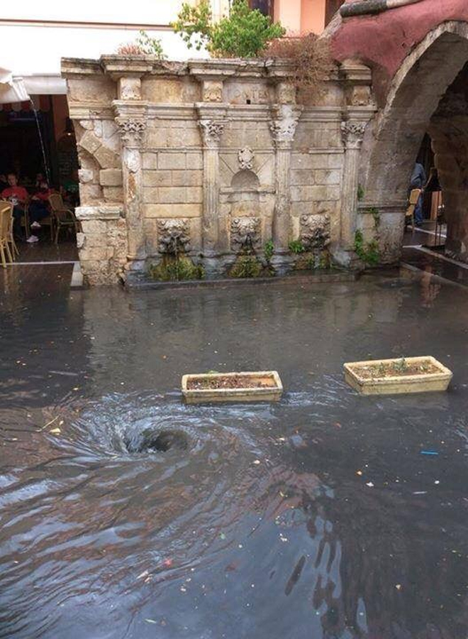 Η καταρρακτώδης βροχή που έπεσε για λίγα λεπτά στην πόλη του Ρεθύμνου την Παρασκευή προκάλεσε πολλά προβλήματα, κυρίως στην παλιά πόλη, δρόμοι της οποίας κατακλύστηκαν από τα νερά.