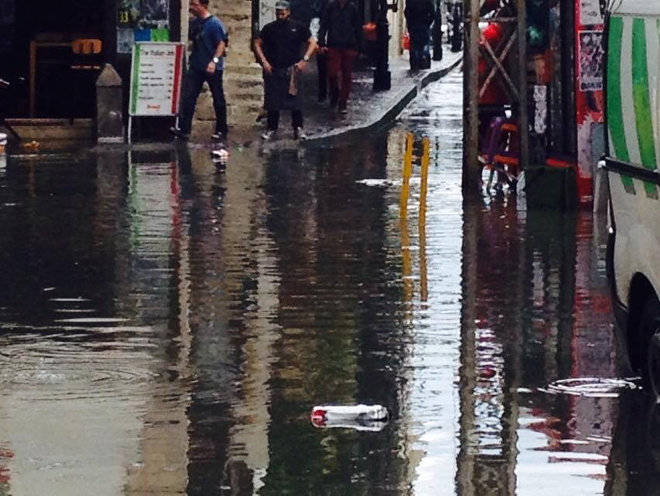 Η κυκλοφορία των οχημάτων γινόταν με δυσκολία, ενώ καταστηματάρχες και κάτοικοι προσπαθούσαν να κρατήσουν τα νερά έξω από σπίτια και επιχειρήσεις.
