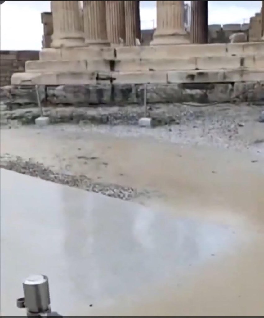 Η Ακρόπολη πλημμύρισε, σύμφωνα με βίντεο που κυκλοφόρησαν, ως αποτέλεσμα των σφοδρών βροχοπτώσεων που έπληξαν την Αττική την Πέμπτη και το πρωί της Παρασκευής.