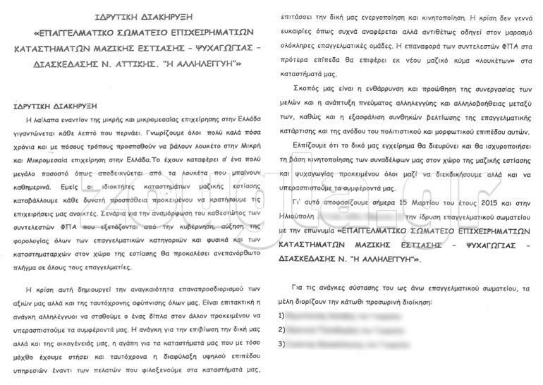 Ειδικότερα, όπως αναφέρει ο Ι. Β. στο υπόμνημά του, «έχω συμπράξει με άλλους ιδιοκτήτες καταστημάτων εστίασης και διασκέδασης στην ίδρυση του σωματείου “Επαγγελματικό Σωματείο Επιχειρηματιών Καταστημάτων Μαζικής Εστίασης – Ψυχαγωγίας – Διασκέδασης Ν. Αττικής “Η Αλληλεγγύη” στην προσπάθεια να αντιταχθούμε στα δυσβάσταχτα οικονομικά μέτρα που έχουν πλήξει τον κλάδο μας και έχουν οδηγήσει στο κλείσιμο μεγάλου αριθμού καταστημάτων εστίασης και ψυχαγωγίας».